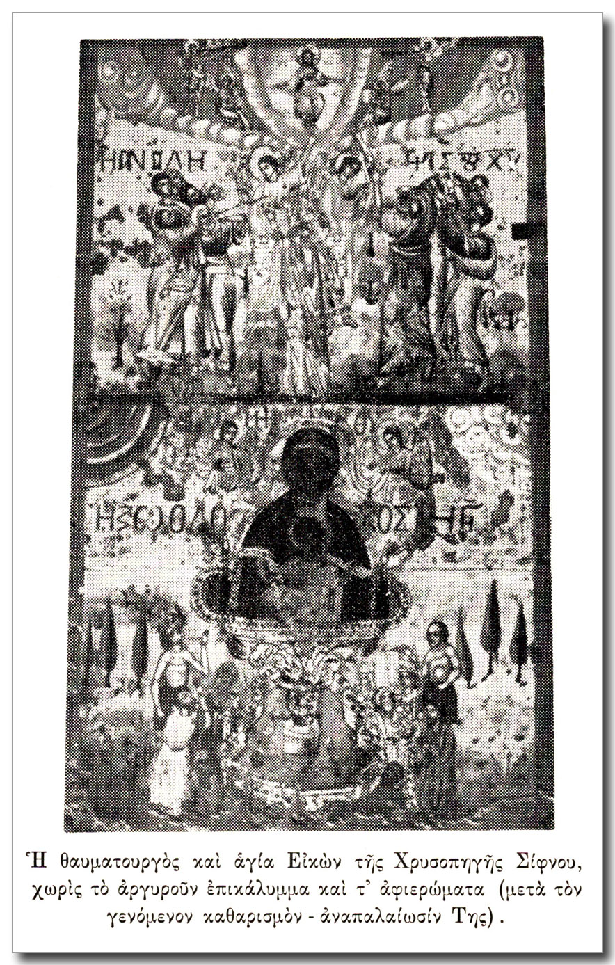 Το πρώτο είναι μια φωτογραφία του δισυπόστατου θαυματουργού εικονίσματος της Χρυσοπηγής μας. Ως γνωστόν το μοναδικό αυτό εικόνισμα αναπαριστά την Ζωοδόχο Πηγή στο κάτω ήμισυ και την Ανάληψη του Κυρίου στο άνω. Ολοι οι ευσεβείς Σιφνιοί είμαστε εξοικειωμένοι με τις αναπαραστάσεις αυτές. Ελάχιστοι όμως –μεταξύ αυτών κι εγώ- έχουν δεί και γνωρίζουν τις πραγματικές ζωγραφικές απεικονίσεις που βρίσκονται κάτω από το αργυρό επικάλλυμα. Ετσι, αναζήτησα και εντόπισα μια σχετικά σπάνια φωτογραφία τους σε ικανοποιητική ποιότητα εκτύπωσης μέσα από το βιβλίο του Αρχιμ. Φιλάρ. Βιτάλη με τίτλο «Θαύματα της Παναγιάς Χρυσοπηγής Σίφνου, Β’» (1991), σελ. 22.