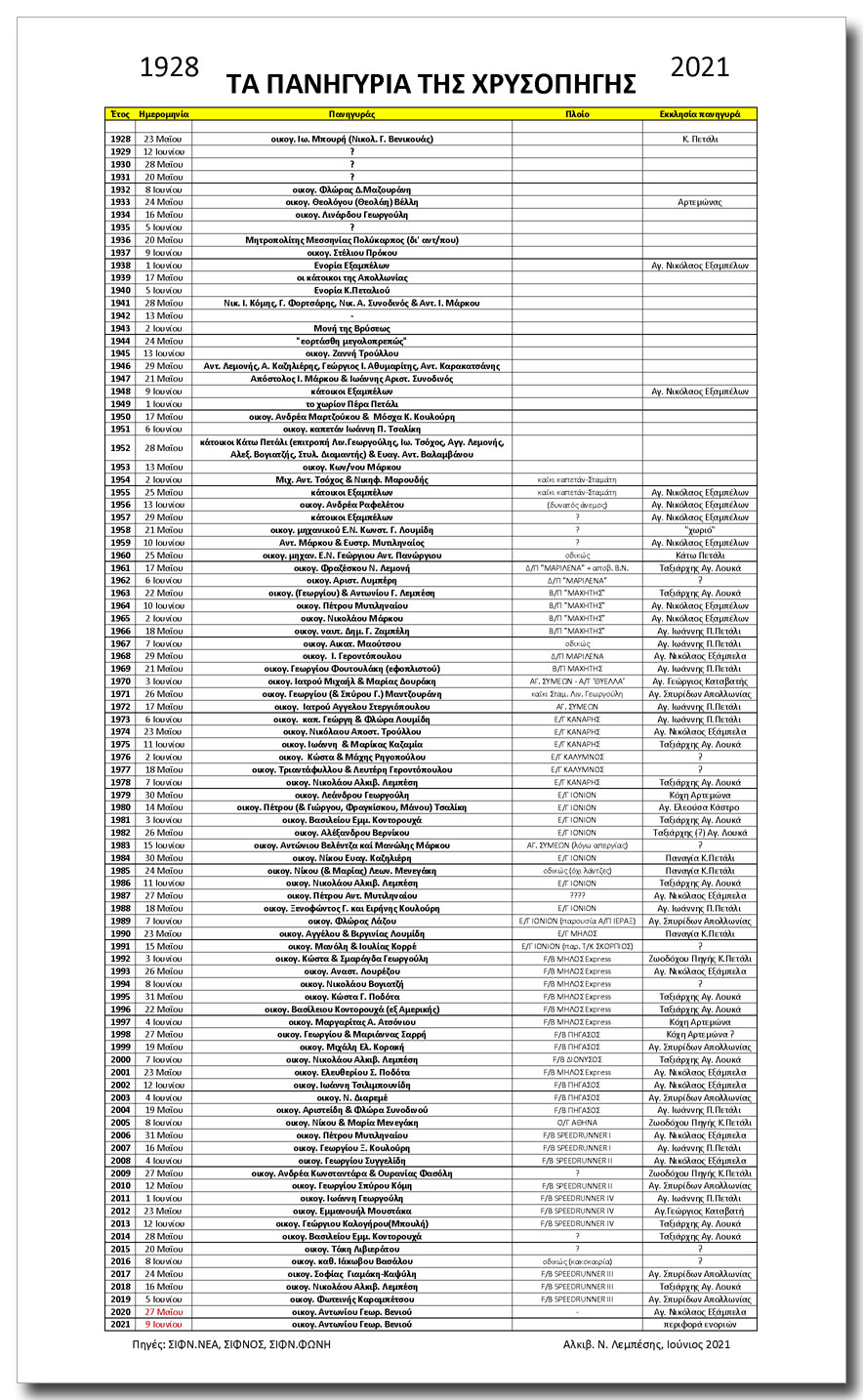 Το δεύτερο αφορά τον πανηγυρισμό της Χρυσοπηγής μας. Σε απόδοση ενός ομολογημένου θαύματος υπέρ υγείας, η Χάρη Της αξίωσε την οικογένειά μας Νικολάου Αλκιβ. Λεμπέση από τον Αη-Λούκα να την εορτάσει τέσσερις φορές στο παρελθόν (1978, 1986, 2000 και 2018). Αυτό με οδήγησε να αναζητήσω μέσα από τον τοπικό Τύπο τους καταγεγραμμένους πανηγυράδες καθώς επίσης και τις ενορίες από όπου προήρχοντο. Κατόρθωσα να συγκεντρώσω στοιχεία για 94 έτη (1928-2021) και τα παρουσιάζω σε ένα πίνακα σε υπόμνηση των μελλοντικών γενεών. Ενα μικρό υποσύνολο από τα τελευταία 350 περίπου χρόνια που επιβιώνει το έθιμο αυτό μέσα από την θρησκευτικότητα των Σιφνίων.