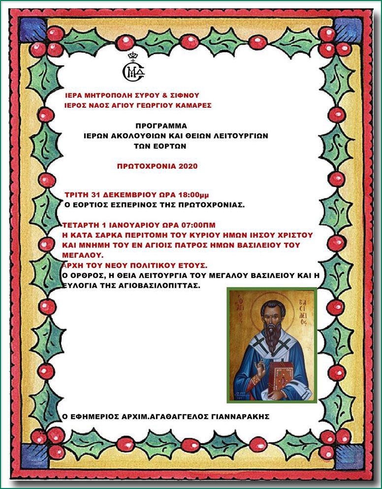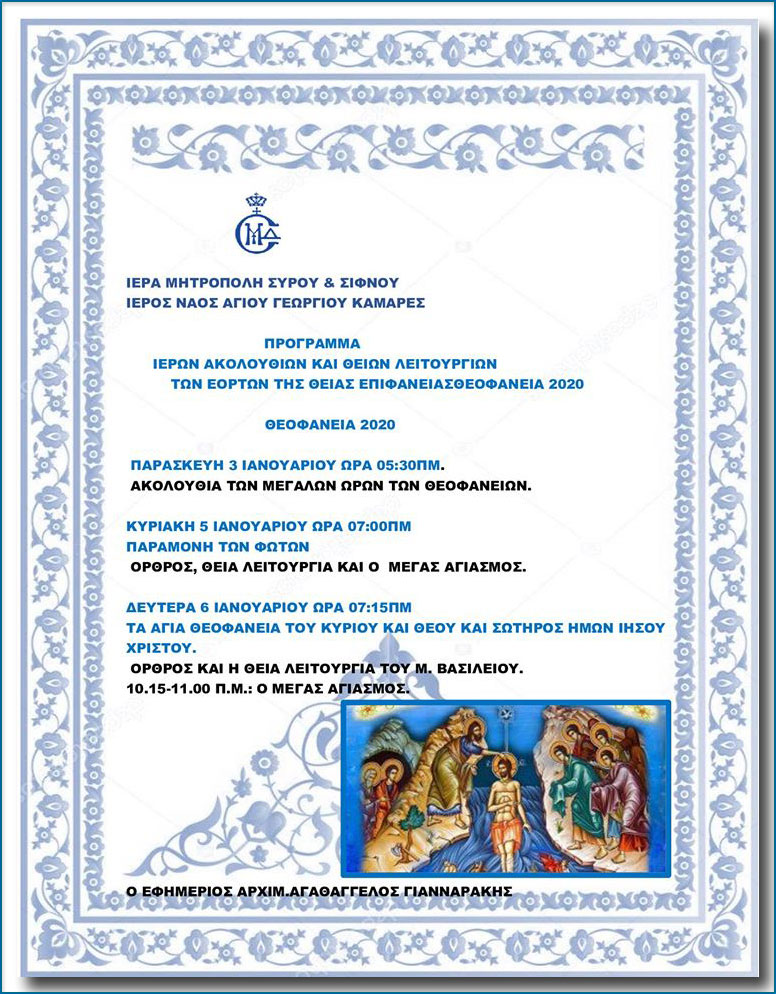 Ι.Ν. Αγίου Γεωργίου Καμαρών Σίφνου: Πρόγραμμα Ιερών Ακολουθιών & Θείων Λειτουργιών Εορτών (Χριστουγέννων – Πρωτοχρονιάς – Θεοφανείων)