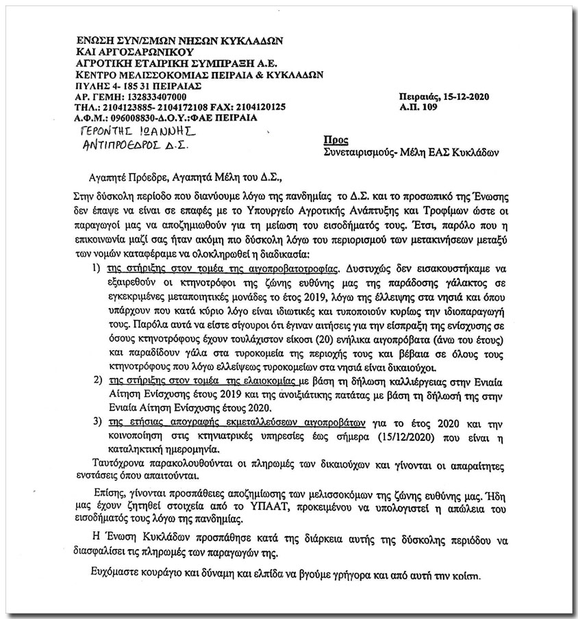 Ένωση Συνεταιρισμών Νήσων Κυκλάδων & Αργοσαρωνικού: Ενημέρωση ενεργειών (15/12/2020).