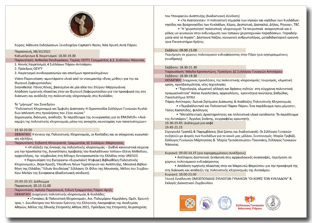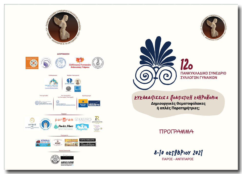 Το έμπρακτο ενδιαφέρον για την νέα πολιτιστική δημιουργία καθώς και την διάσωση και την ανάδειξη της πολιτισμικής κληρονομιάς των Κυκλάδων αποτυπώνεται στο πρόγραμμα του 12ο Πανκυκλαδικού Συνέδριου της Ομοσπονδίας Συλλόγων Γυναικών Κυκλάδων που διοργανώνεται στα νησιά της Πάρου και της Αντιπάρου από την Παρασκευή 8 έως την Κυριακή 10 Οκτωβρίου 2021. Θα υλοποιηθεί σε συνεργασία με τους 4 Συλλόγους Γυναικών της Περιφερειακής Ενότητας Πάρου-Αντιπάρου: Σύλλογος Γυναικών Αντιπάρου, Σύλλογος Γυναικών Νάουσας Πάρου, Σύλλογος Γυναικών Μάρπησσας και Σύλλογος Γυναικών Πάρου “Αρηίς”.