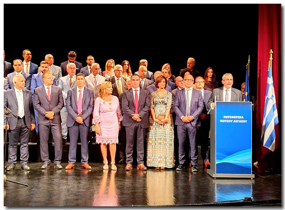 Ο Περιφερειάρχης και το νέο Περιφερειακό Συμβούλιο ορκίστηκαν ενώπιον  της θρησκευτικής ηγεσίας του τόπου,  Σεβασμιώτατου Μητροπολίτη Σύρου, κ.κ. Δωρόθεου Β’, και  Επισκόπου  Καθολικών, κ.κ. Πέτρου Στεφάνου, παρουσία του Υπουργού Εργασίας και Κοινωνικών Υποθέσεων, Γιάννη Βρούτση, του Υφυπουργού Τουρισμού, Μάνου Κόνσολα, του βουλευτή Δωδεκανήσου, Βασίλη Υψηλάντη, των βουλευτών Κυκλάδων Φίλιππου Φόρτωμα,  Κατερίνας Μονογυιού και Νίκου Συρμαλένιου, του δημάρχου Σύρου, Νικολάου Λειβαδάρα, του δημάρχου Ρόδου, Αντώνη Καμπουράκη, του Δημάρχου Άνδρου, Δημήτρη Λοτσάρη, του δημάρχου Μυκόνου, Κωνσταντίνου Κουκά, του δημάρχου Αμοργού, Λευτέρη Καραΐσκου, του Γ.Γ. Αποκεντρωμένης Διοίκησης Αιγαίου, Πολύκαρπου Πολυχρονάκη, εκπροσώπων των Σωμάτων Ασφαλείας, καθώς επίσης και εκπροσώπων των παραγωγικών και κοινωνικών και πολιτιστικών φορέων.