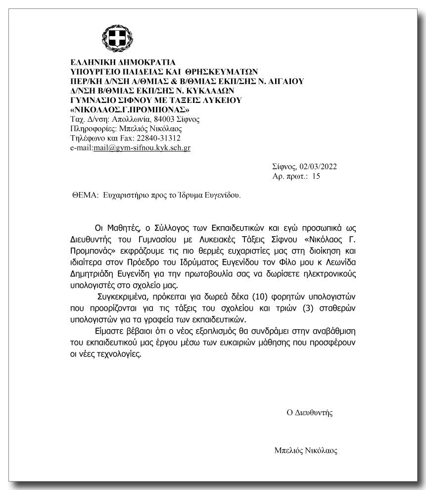 Γυμνάσιο με τάξεις Λυκείου Σίφνου “Νικόλαος Προμπονάς”: Ευχαριστήριο στο Ίδρυμα Ευγενίδου