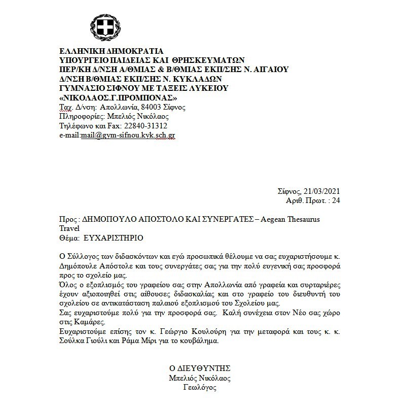 Γυμνάσιο με τάξεις Λυκείου Σίφνου “Νικόλαος Προμπονάς”: Ευχαριστήριο προς Απόστολο Δημόπουλο & Συνεργάτες του Aegean Thesaurus Travel