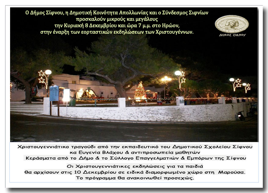 O Δήμος Σίφνου, η Δημοτική Κοινότητα Απολλωνίας και ο Σύνδεσμος Σιφνίων προσκαλούν μικρούς και μεγάλους την Κυριακή 8 Δεκεμβρίου και ώρα 7 μ.μ. στο Ηρώον, στην έναρξη των εορταστικών εκδηλώσεων των Χριστουγέννων.