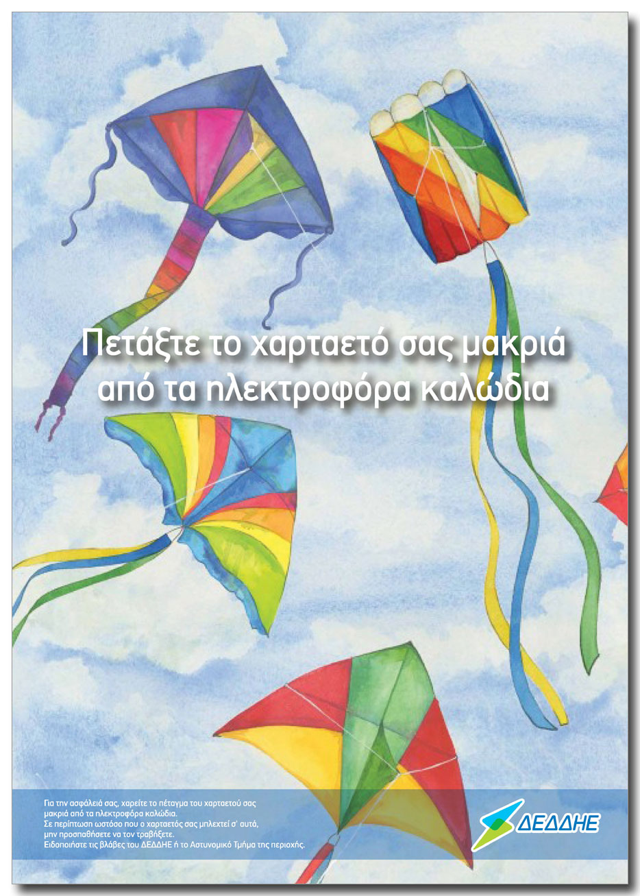 Ο Διαχειριστής Ελληνικού Δικτύου Διανομής Ηλεκτρικής Ενέργειας (ΔΕΔΔΗΕ) σας συμβουλεύει να μην πετάτε το χαρταετό σας κοντά σε ηλεκτροφόρα καλώδια, καθώς υπάρχει σοβαρός κίνδυνος ηλεκτροπληξίας για εσάς και διακοπής της παροχής ρεύματος στη γύρω περιοχή.