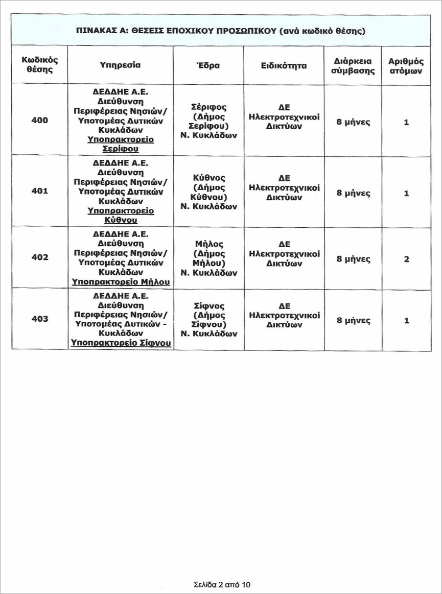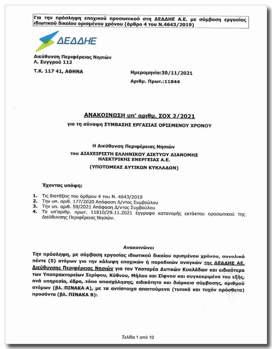Την πρόσληψη, με σύμβαση εργασίας ιδιωτικού δικαίου ορισμένου χρόνου, συνολικά πέντε (5) ατόμων για την κάλυψη εποχικών ή παροδικών αναγκών της ΔΕΔΔΗΕ ΑΕ, Διεύθυνσης Περιφέρειας Νησιών για τον Υποτομέα Δυτικών Κυκλάδων και ειδικότερα των Υποπρακτορείων Σερίφου, Κύθνου, Μήλου και Σίφνου και συγκεκριμένα…