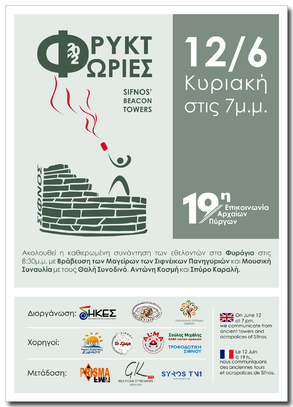 20 χρόνια μετά την πρώτη σύγχρονη επικοινωνία των Αρχαίων πύργων της Σίφνου και μετά από μια χρονιά αναγκαστικού ΄κλεισίματος΄, την Κυριακή 12 Ιουνίου 2022, ξαναδίνουμε ζωή στα απομεινάρια του αρχαιολογικού πλούτου της Σίφνου, με την 19η ετήσια επικοινωνία εκατοντάδων εθελοντών που θα διασκορπιστούν σ’ όλη την έκταση του νησιού για να στείλουν μήνυμα αισιοδοξίας & συναδέλφωσης στο Αρχιπέλαγος.