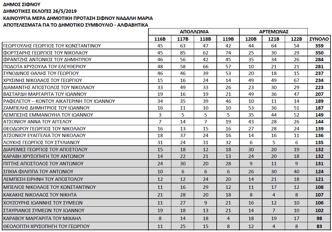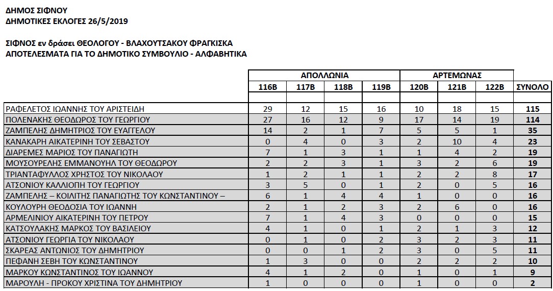 ΣΙΦΝΟΣ: ΑΠΟΤΕΛΕΣΜΑΤΑ ΣΤΑΥΡΟΔΟΣΙΑΣ ΥΠΟΨΗΦΙΩΝ ΔΗΜΟΤΙΚΟΥ ΣΥΜΒΟΥΛΙΟΥ ΣΙΦΝΟΥ 26/5/2019