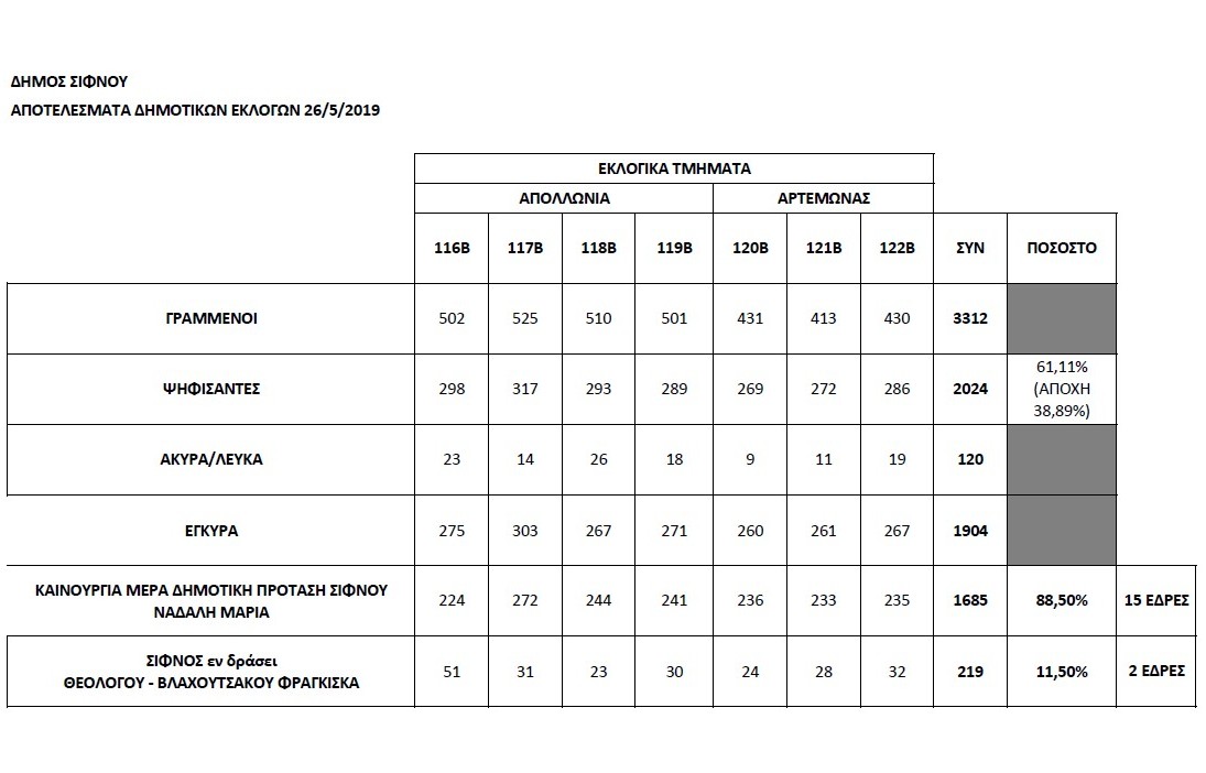ΣΙΦΝΟΣ: ΑΠΟΤΕΛΕΣΜΑΤΑ ΔΗΜΟΤΙΚΩΝ ΕΚΛΟΓΩΝ ΣΙΦΝΟΥ 26/5/2019