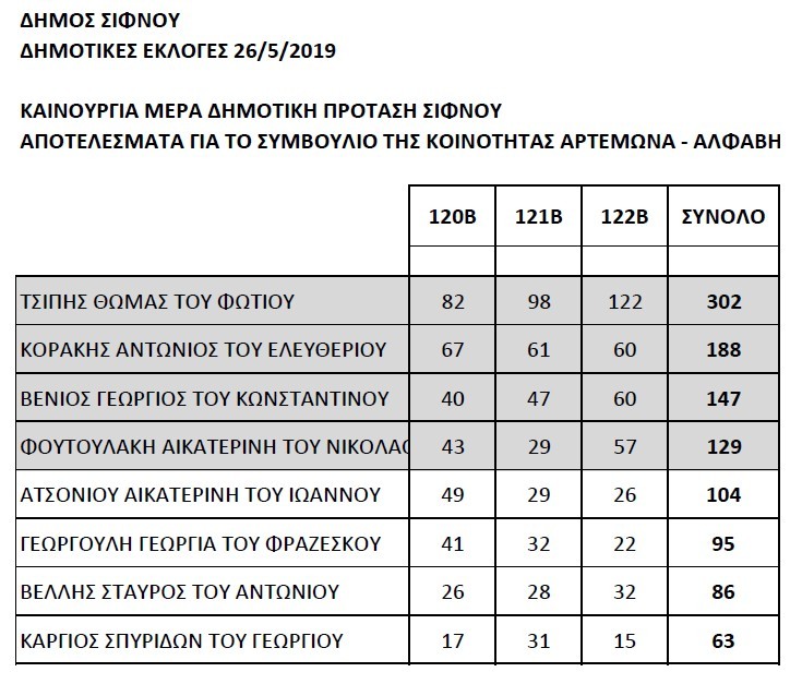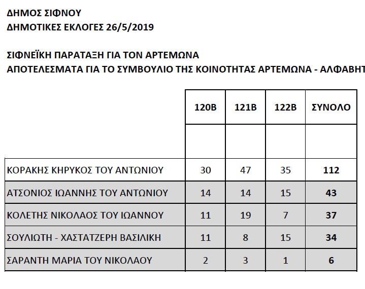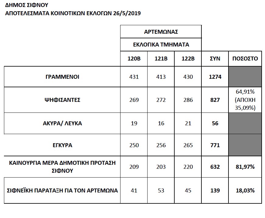 ΣΙΦΝΟΣ: ΑΠΟΤΕΛΕΣΜΑΤΑ ΚΟΙΝΟΤΙΚΩΝ ΕΚΛΟΓΩΝ ΑΡΤΕΜΩΝΑ ΣΙΦΝΟΥ 26/5/2019