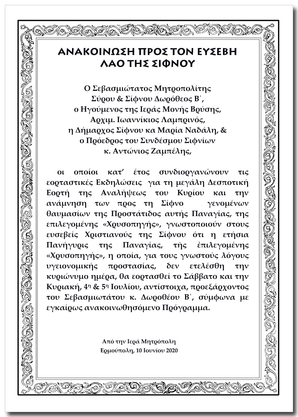 οι οποίοι κατ’ έτος συνδιοργανώνουν τις εορταστικές Εκδηλώσεις για τη μεγάλη Δεσποτική Εορτή της Αναλήψεως του Κυρίου και την ανάμνηση των προς τη Σίφνο γενομένων θαυμασίων της Προστάτιδος αυτής Παναγίας, της επιλεγομένης «Χρυσοπηγής», γνωστοποιούν στους ευσεβείς Χριστιανούς της Σίφνου ότι η ετήσια Πανήγυρις της Παναγίας, τῆς ἐπιλεγομένης «Χρυσοπηγής», η οποία, για τους γνωστούς λόγους υγειονομικής προστασίας, δεν ετελέσθη την κυριώνυμο ημέρα, θα εορτασθεί το Σάββατο και την Κυριακή, 4η και 5η Ιουλίου, αντίστοιχα, προεξάρχοντος του Σεβασμιωτάτου κ. Δωροθέου Β΄, σύμφωνα με εγκαίρως ανακοινωθησόμενο Πρόγραμμα.