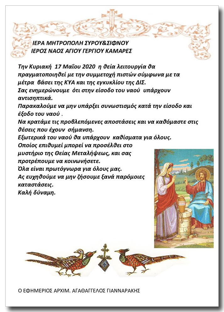 Tags Ι.Ν. Αγίου Γεωργίου Καμαρών Σίφνου: Κάλεσμα στην Θεία Λειτουργία της Κυριακής 17ης Μαΐου 2020