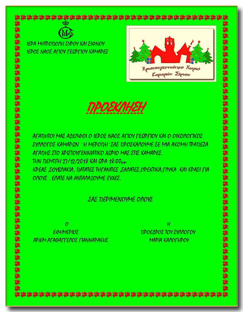 Home / Εν Σίφνω / Εκκλησιαστικά / Ι.Ν. Αγίου Γεωργίου Καμαρών Σίφνου: “Κάλεσμα σε Τράπεζα Αγάπης για Ανταλλαγή Ευχών στο Χριστουγεννιάτικο Χωριό Καμαρών” (27/12) Ι.Ν. Αγίου Γεωργίου Καμαρών Σίφνου: “Κάλεσμα σε Τράπεζα Αγάπης για Ανταλλαγή Ευχών στο Χριστουγεννιάτικο Χωριό Καμαρών” (27/12)