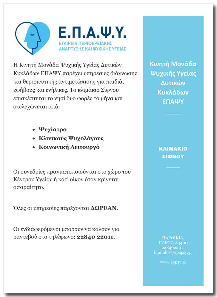 Κινητή Μονάδα Ψυχικής Υγείας Δυτικών Κυκλάδων ΕΠΑΨΥ – Κλιμάκιο Σίφνου: ΑΝΑΚΟΙΝΩΣΗ