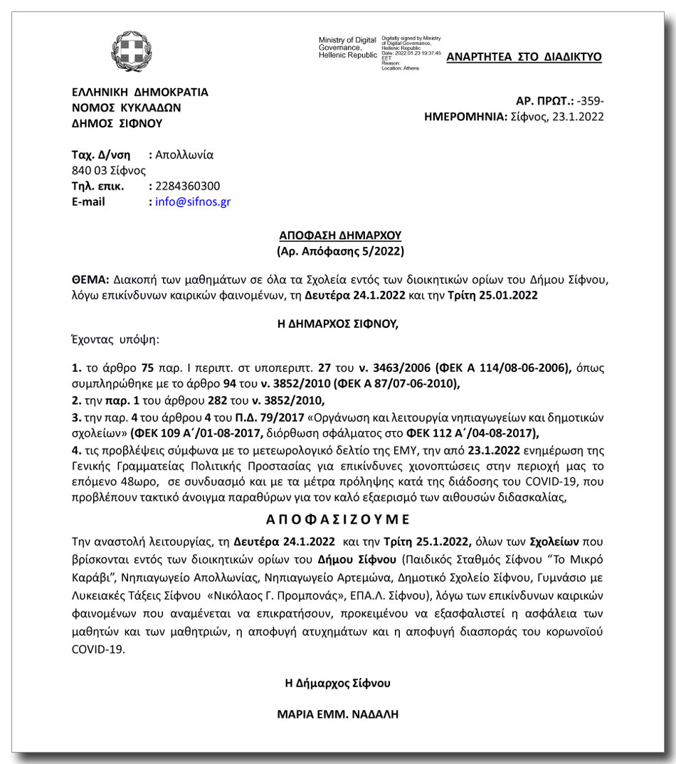 Κλειστά τα σχολεία στη Σίφνο Δευτέρα & Τρίτη - Απόφαση Δημάρχου .
