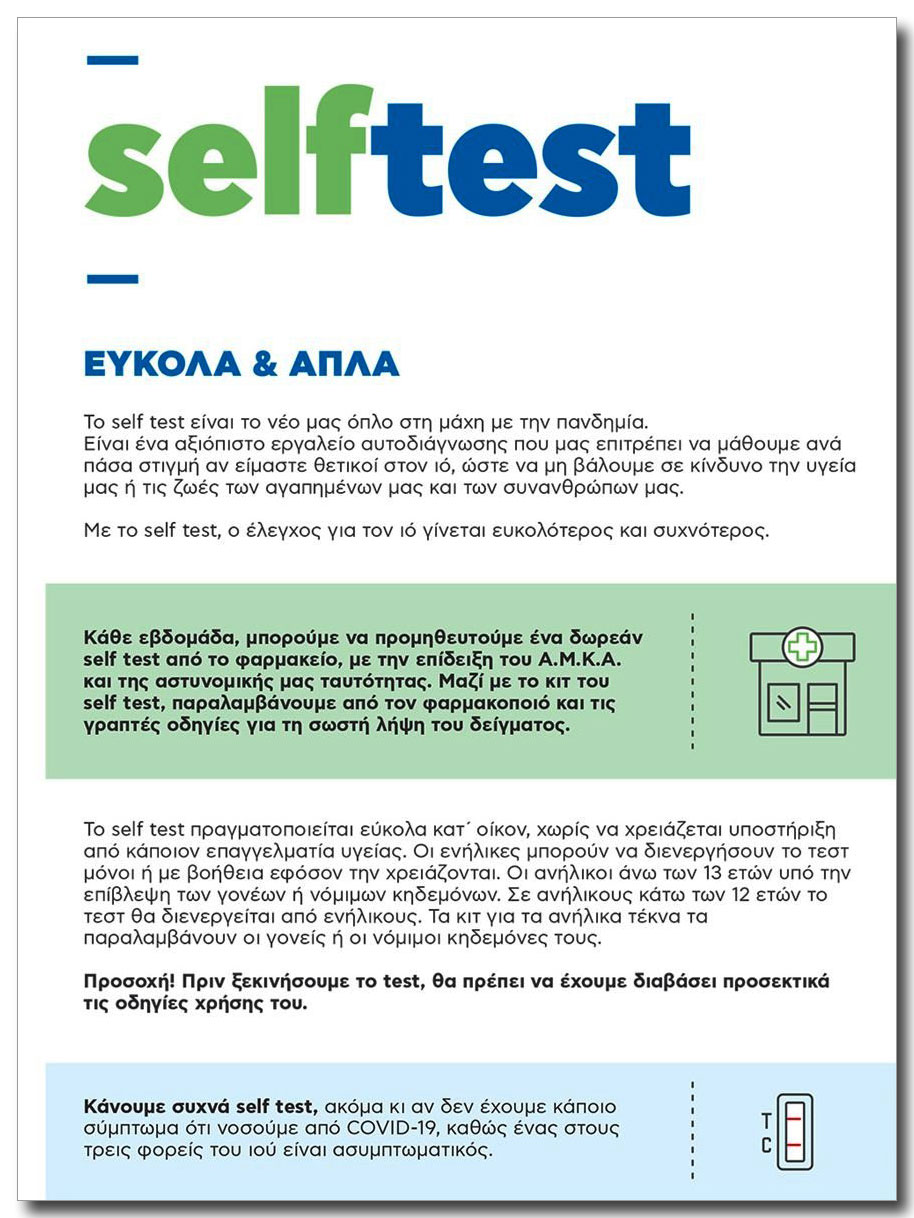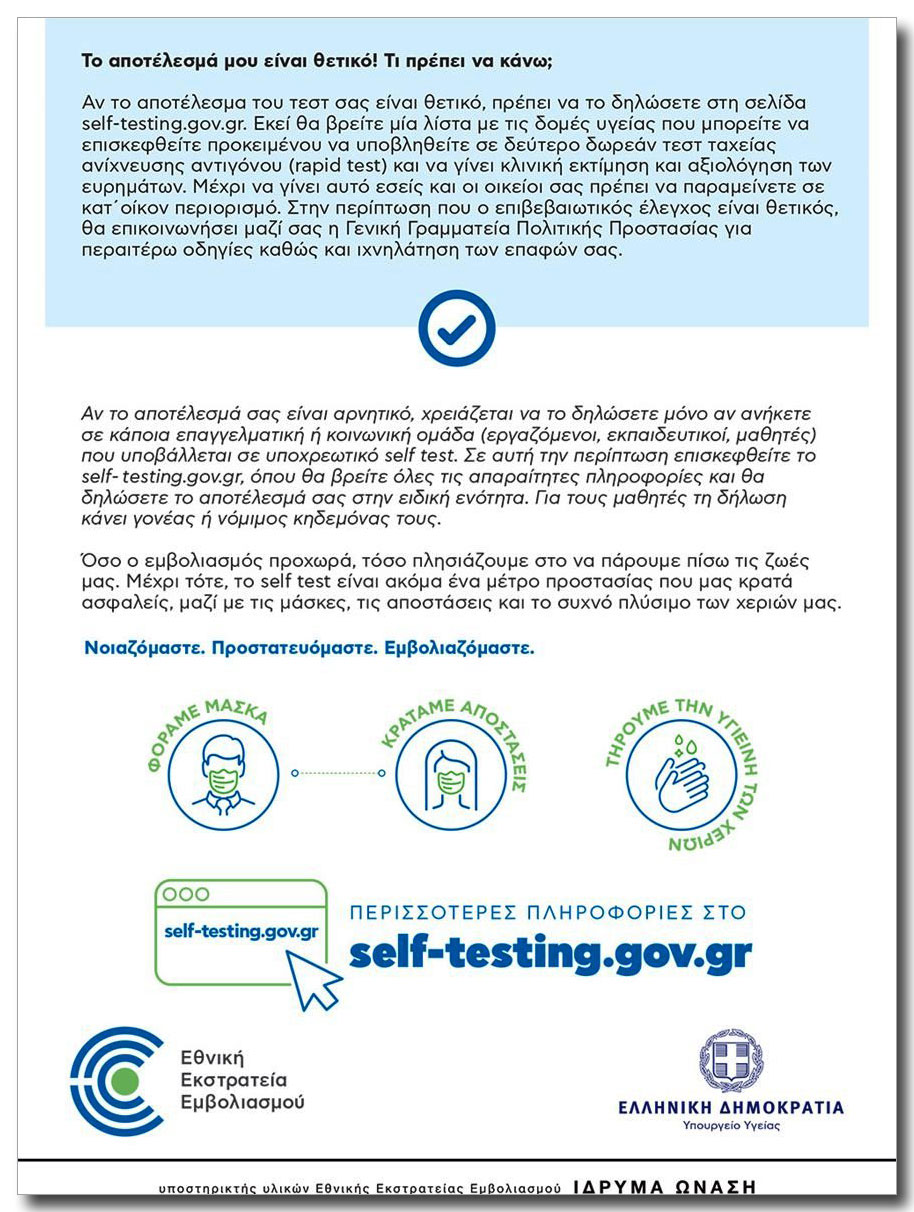 Μαζί με τα τεστ οι πολίτες θα λαμβάνουν ενημερωτικό φυλλάδιο και φυσικά οδηγίες στα ελληνικά.