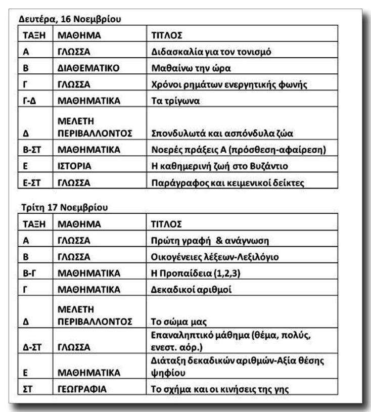 – Εκπαιδευτική τηλεόραση: Από τη Δευτέρα το πρωί στις 9 π.μ. -πρώτη ημέρα εφαρμογής των μέτρων- θα αρχίσουν να προβάλλονται από την ΕΡΤ2 τηλεοπτικά μαθήματα για μαθητές δημοτικού. Το πρόγραμμα για την Δευτέρα και την Τρίτη είναι το παρακάτω: