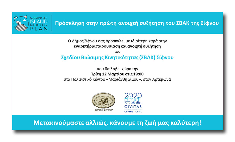 Ο Δήμος Σίφνου σας προσκαλεί στην εναρκτήρια παρουσίαση και ανοικτή συζήτηση του Σχεδίου Βιώσιμης Κινητικότητας (ΣΒΑΚ) Σίφνου που θα λάβει χώρα την Τρίτη 12 Μαρτίου στις 19:00 στο Πολιτιστικό Κέντρο «Μαριάνθη Σίμου» στον Αρτεμώνα.