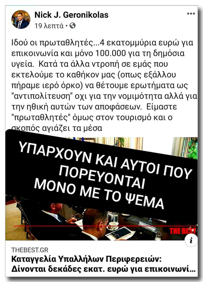 ΗΘΙΚΟΝ ΔΙΔΑΓΜΑ: Αποδεικνύεται ότι όταν σας συκοφαντεί η αντιπολίτευση πρέπει κάθεστε σιωπηλοί και ήσυχοι να ανέχεστε τον φασισμό των συκοφαντών. Διότι εμείς που τολμήσαμε να αντιδράσουμε στην διακίνηση του ψεύδους ότι διαθέσαμε μόνο 100.000,00 ευρώ για την αντιμετώπιση της πανδημίας, δεχόμαστε τώρα ακόμα μεγαλύτερη επίθεση σε πλήρη “αρμονία” και αξιοθαύμαστη ταύτιση με γνωστά Μέσα Παραπληροφόρησης που εργολαβικά υβρίζουν, ενδιαφερόμενα– ακόμα και εν μέσω πανδημίας – μόνο για αυτό που υπηρετούν: το χρήμα.ε