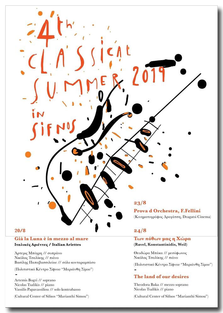 με τους: Άρτεμις Μπόγρη//Σοπράνο, Νικόλας Τσαλίκης//πιάνο και Βασίλης Παπαβασιλείου//σόλο κοντραμπάσο, στο Πολιτιστικό Κέντρο Σίφνου “Μαριάνθη Σίμου”, ώρα 21.00 (Ελεύθερη είσοδος) - Παρασκευή 23/8/19 Prova d’Orchestra(1978), F. Fellini. Μια πρόβα ορχήστρας, καταγραμμένη με διαβρωτικό σαρκασμό από τον διάσημο σκηνοθέτη. Δημοτικός Κινηματογράφος “Δραγάτση” Αρτεμώνας. (Ελεύθερη Είσοδος)