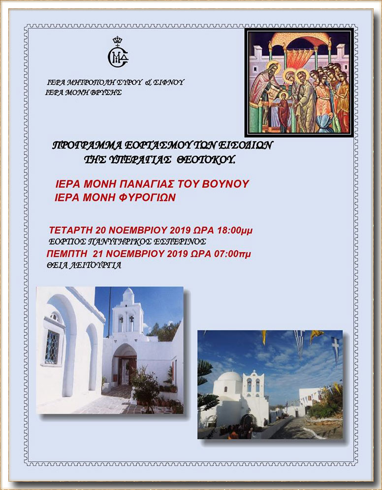 ΠΡΟΓΡΑΜΜΑ ΕΟΡΤΑΣΜΟΥ ΕΙΣΟΔΙΩΝ ΤΗΣ ΘΕΟΤΟΚΟΥ ΣΤΗΝ Ι.Μ. ΠΑΝΑΓΙΑΣ ΤΟΥ ΒΟΥΝΟΥ & ΣΤΗΝ Ι.Μ. ΦΥΡΟΓΙΩΝ ΣΙΦΝΟΥ (20 & 21/11/2019)