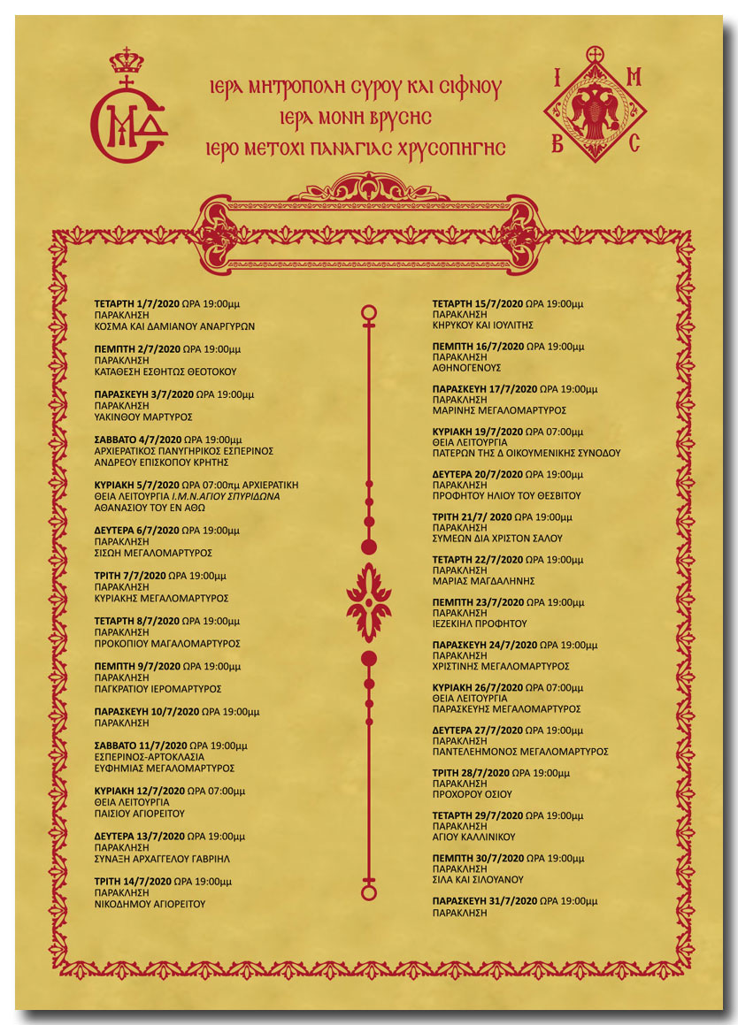 . Πρόγραμμα Ιερών Ακολουθιών Παναγίας Χρυσοπηγής Σίφνου Ιουλίου 2020 . . .
