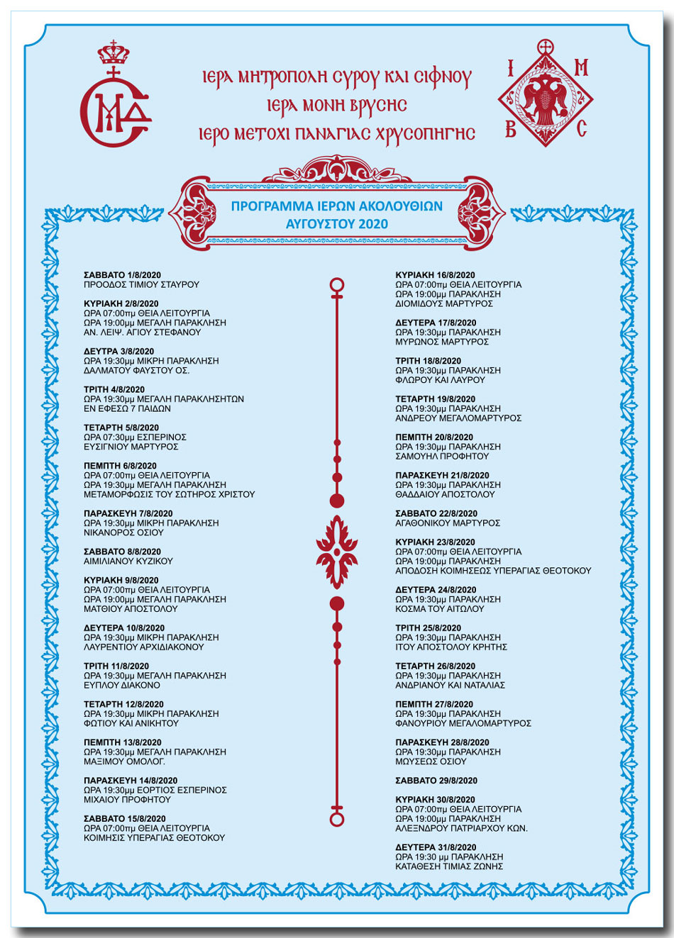 . Πρόγραμμα Ιερών Ακολουθιών Παναγίας Χρυσοπηγής Σίφνου Αυγούστου 2020 . .