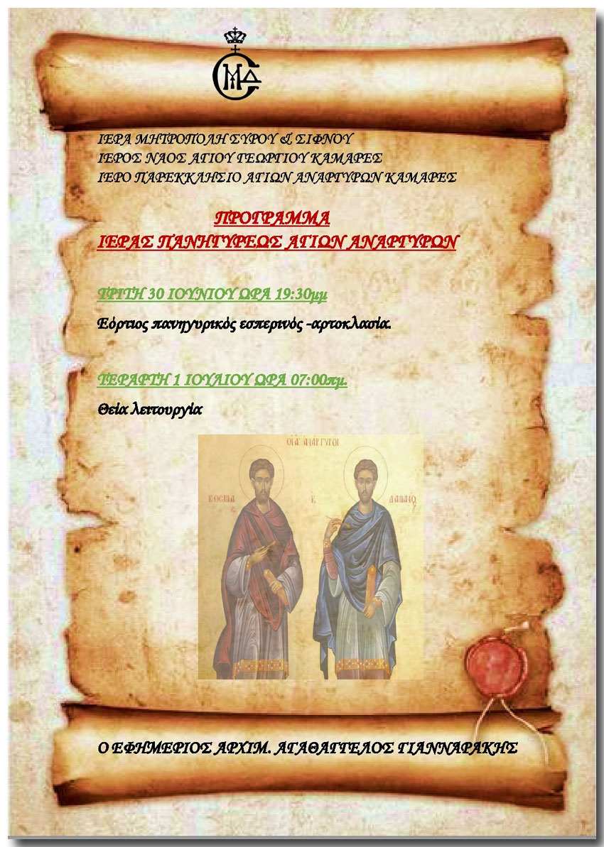 Πρόγραμμα πανηγυρικού Εσπερινού & Θείας Λειτουργίας των Αγίων Αναργύρων Καμαρών Σίφνου (30/6 & 1/7/2020)