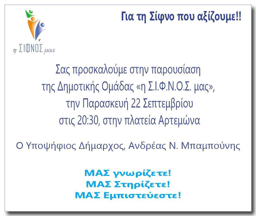 Home / Εκλογικά / Σίφνος - Δημοτικές Εκλογές / Πρόσκληση στην Παρουσίαση της Δημοτικής Ομάδας “η Σ.Ι.Φ.Ν.Ο.Σ. μας” [Αρτεμώνας 22/9/2023]