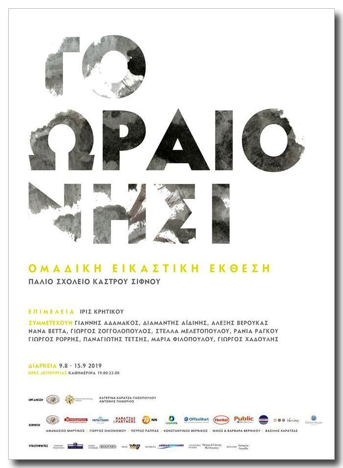Ο Πολιτιστικός Σύλλογος Σίφνου, υπό την αιγίδα του Δήμου Σίφνου, διοργανώνει από τις 9 Αυγούστου έως και τις 15 Σεπτεμβρίου 2019 Εικαστική Έκθεση στο παλιό Δημοτικό Σχολείο Κάστρου Σίφνου διακεκριμένων Ελλήνων δημιουργών υπό το τίτλο «Το Ωραίο Νησί».
