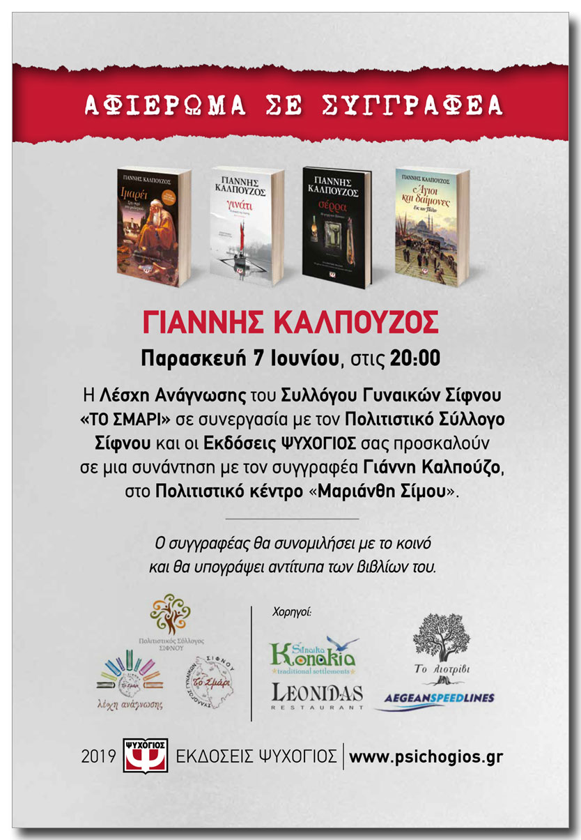 Η Λέσχη Ανάγνωσης του Συλλόγου Γυναικών Σίφνου «ΤΟ ΣΜΑΡΙ» σε συνεργασία με τον Πολιτιστικό Σύλλογο Σίφνου και οι Εκδόσεις ΨΥΧΟΓΙΟΣ σας προσκαλούν σε μια συνάντηση με τον συγγραφέα Γιάννη Καλπούζο, στο Πολιτιστικό κέντρο «Μαριάνθη Σίμου”.