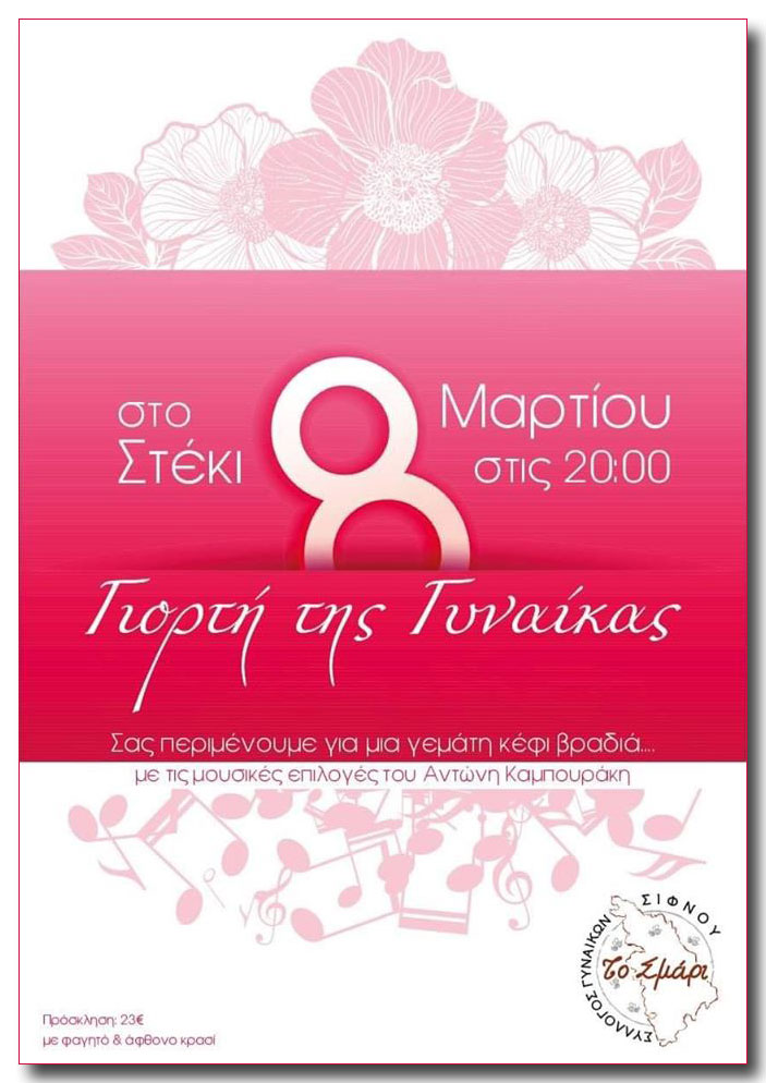 Σύλλογος Γυναικών Σίφνου ΤΟ ΣΜΑΡΙ: Σας περιμένουμε στον χορό μας για την ΓΙΟΡΤΗ ΤΗΣ ΓΥΝΑΙΚΑΣ (8/3/2020 στο Στέκι)