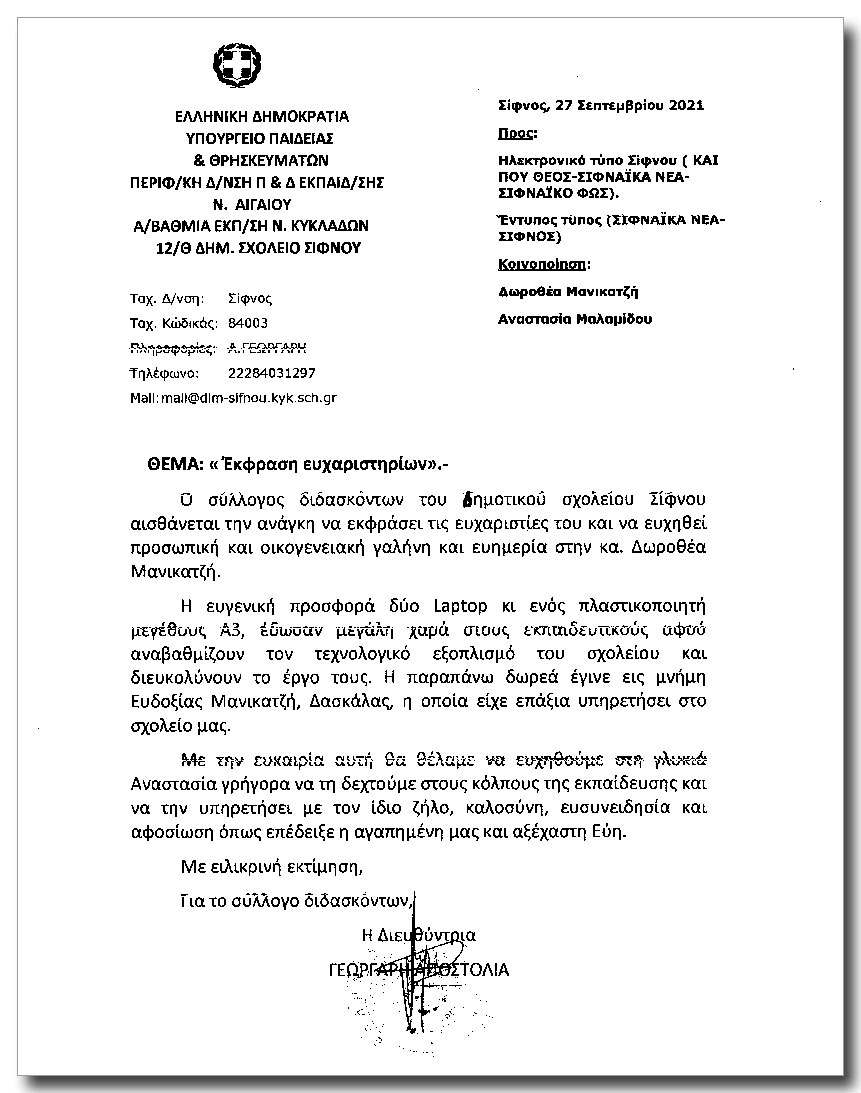 . Σύλλογος Διδασκόντων Δημοτικού Σχολείου Σίφνου: "Έκφραση Ευχαριστηρίων" .