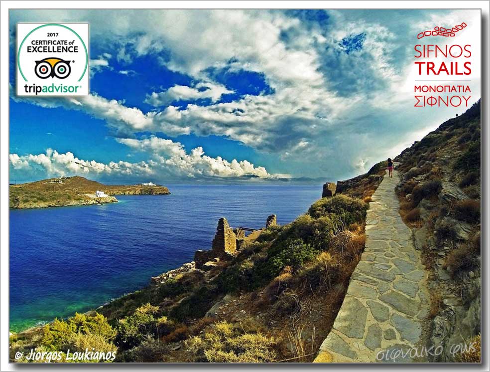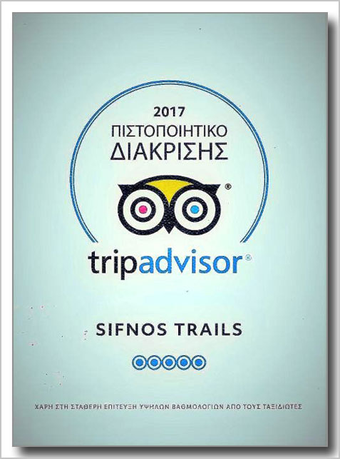 Άλλη μια διάκριση έρχεται να τιμήσει τα μονοπάτια της Σίφνου «Sifnos Trails». Τα σχόλια των επισκεπτών της Σίφνου στο TripAdvisor, τα οποία κάνουν μνεία στις ομορφιές του νησιού και στην άρτια σηματοδότηση, χάρισαν στη Σίφνο το Πιστοποιητικό Διάκρισης του TripAdvisor. Το TripAdvisor απονέμει το Πιστοποιητικό Διάκρισης σε καταλύματα, αξιοθέατα και εστιατόρια που σταθερά κερδίζουν εξαιρετικές κριτικές από τους ταξιδιώτες.