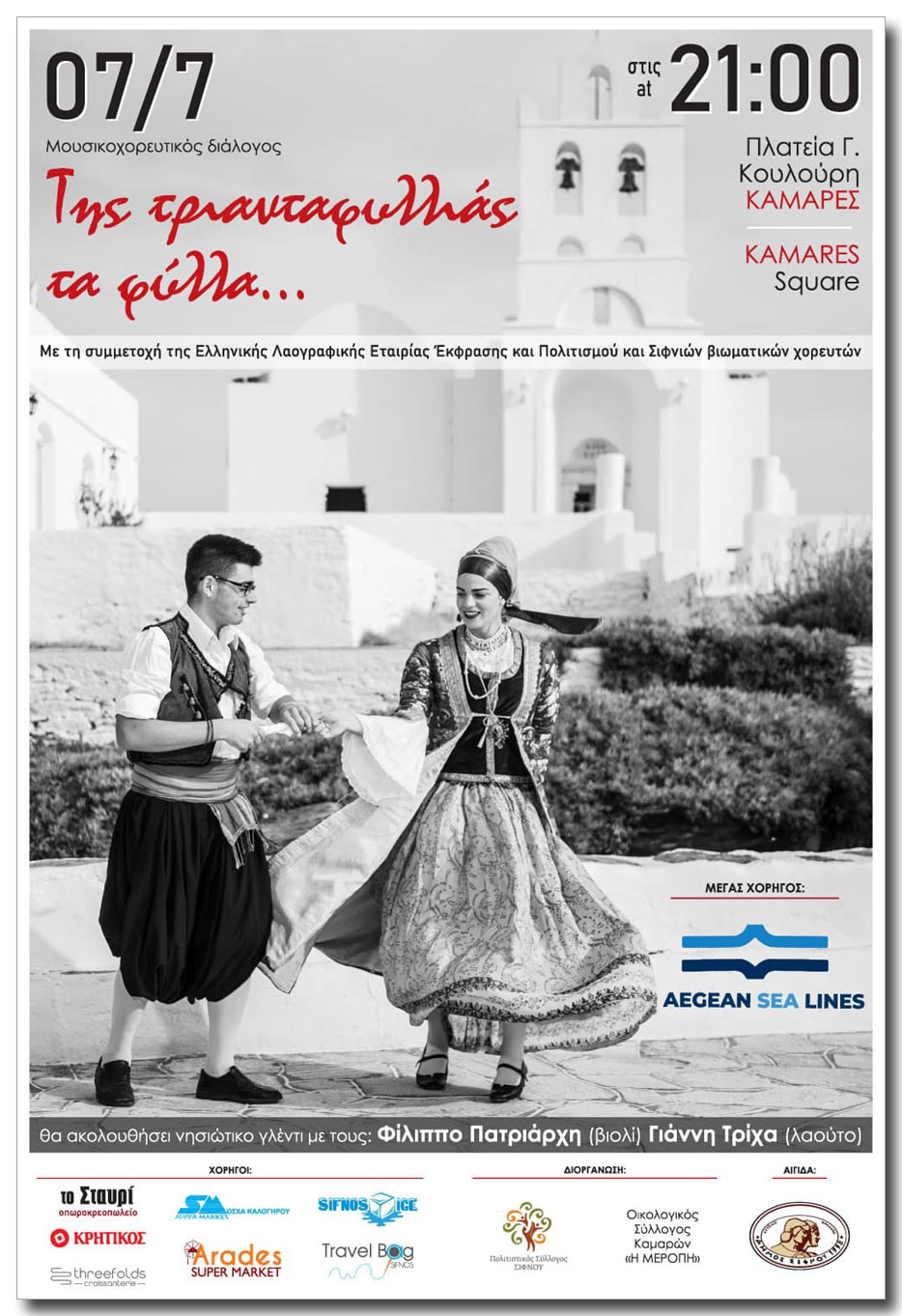 Σας προσκαλούμε την Παρασκευή 7 Ιουλίου στις 21:00 στην Πλατεία Γεωργίου Κουλούρη στις Καμάρες, σε έναν μουσικοχορευτικό διάλογο με τίτλο ”Της τριανταφυλλιάς τα φύλλα”, με τη συμμετοχή της Ελληνικής Λαογραφικής Εταιρίας Έκφρασης και Πολιτισμού ΕΛΛΗΝΙΚΗ ΛΑΟΓΡΑΦΙΚΗ ΕΤΑΙΡΕΙΑ ΕΚΦΡΑΣΗΣ & ΠΟΛΙΤΙΣΜΟΥ (Ε.Λ.Ετ.Ε.Π) και Σιφνιών βιωματικών χορευτών.
